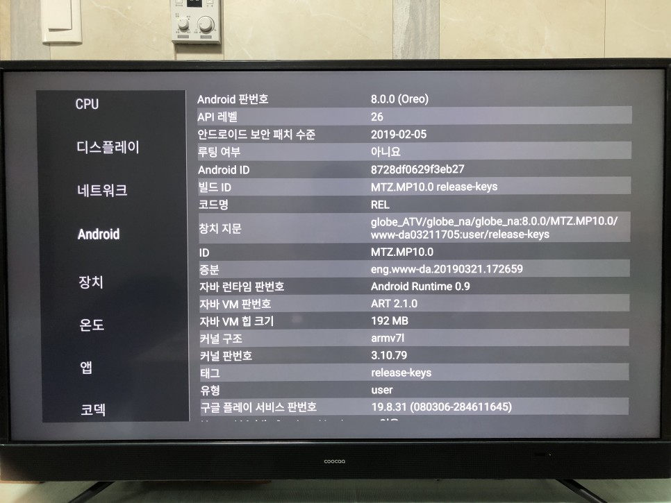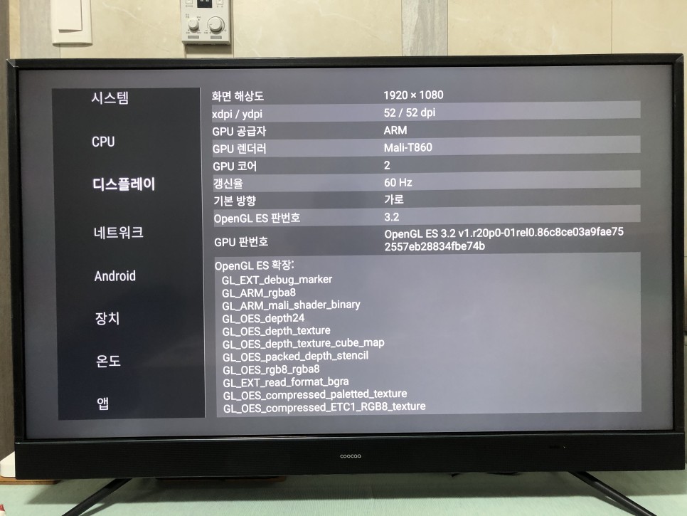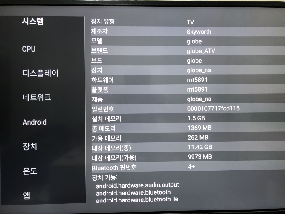 1. 메인 칩셋: MT 5891. 바로 위에 공식 판매처에 가보시면 MT 5658이라고 나와있습니다. 하지만 제가 TV에 AIDA64 (하드웨어 스펙을 분석해주는 툴)를 직접 설치해서 돌려보니 MT5891이었습니다. 크게 다른 스펙은 아니지만 숫자가 더 높으니 기분은 좋습니다. ARM A53 쿼드코어에 1.5G 램이 탑재되어 있고 내장메모리는 여유공간 약 10기가입니다. 이 아래 관련 스크린샷들 모두 첨부해두었습니다.