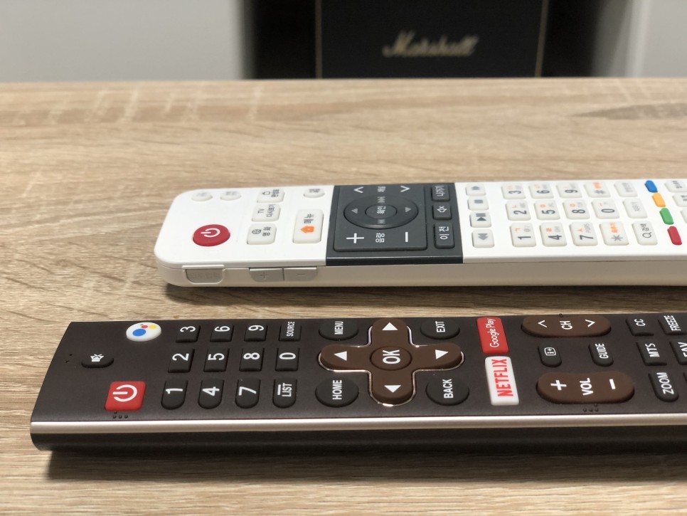 리모콘도 이야기할 거리가 조금 있습니다. 사실 지금 껏 리모컨 퀄리티를 따져본 적이 없었습니다. 기존에 사용하던 TV가 스마트 TV가 아니었기 때문에 화질/음질 조절을 할 때만 아주 가끔 티비 구매시 제공되는 리모콘을 사용했었고, 그 외에는 셋톱박스 (저의 경우 KT 올레 티비) 리모콘을 쓰다보니 선택하고 말것도 없던 거죠. 그런데 이 리모콘은 버튼들이 볼륨감이 있는게 손에 꽤나 잘 달라붙었습니다. 특히 우측 상단에 구글어시스턴트 버튼은 유튜브 검색시 아주 유용합니다. 블루투스 4.0도 지원되어서 무선 키보드를 연결할 수도 있겠지만 어지간히 복잡한 것도 잘 알아먹습니다. 물론 일반 구글 어시스턴트처럼 날씨나 미세먼지, 시덥잖은 농담도 잘 알려주지만 '알람'은 안 되더군요. 저는 구글 미니도 침대 옆에 두고 쓰는데 알람 기능 유용합니다. 알람만.