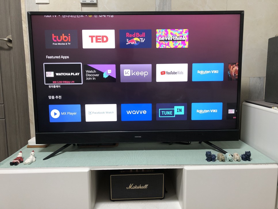 (중소기업 TV 디자인은 천편일률적이라 다른점 찾기가 힘듭니다. 그런데 쿠카TV는 하단에 사운드바처럼 살짝 튀는 디자인을 갖고 있습니다. 스피커 모듈은 중앙 로고를 기준으로 좌우에 위치해 있고 소리도 나쁘지 않네요. 2년내에 고장나면 A/S 받으면 되죠. coocaa 로고도 작고 동글동글한 폰트로 촌스럽지 않게 박혀있습니다. Wifi 중요하다고 써놨는데, 실제로 사용하다보니 고화질 영상을 끊김없이 감상하기 위해 그냥 유선랜을 쓰고 있습니다...)