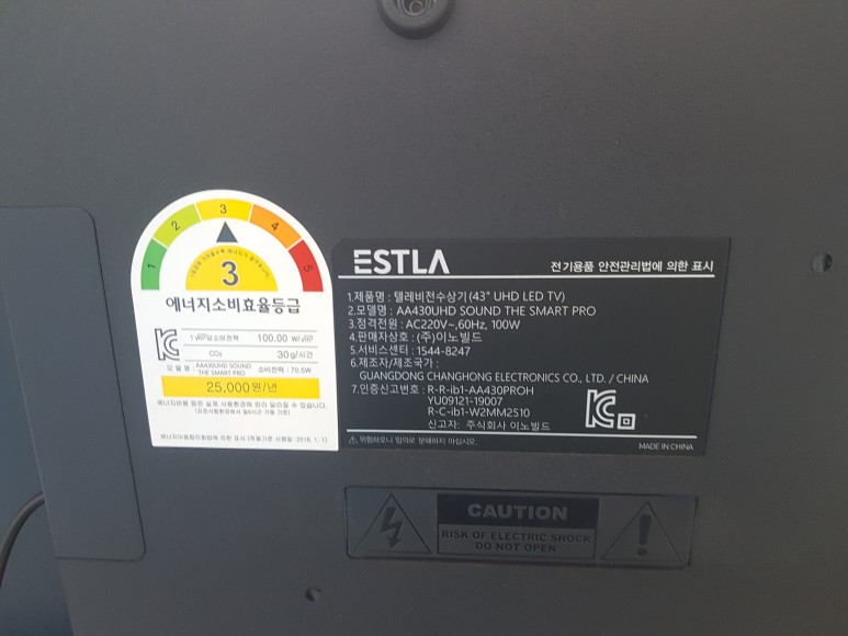 제조는 AA430UHD 2019년 버전과 동일한 창홍이라는 제조사에서 생산한 제품이라고 되어 있습니다. 중국 5대 TV 생산 제조사 중 하나라고 했지요?