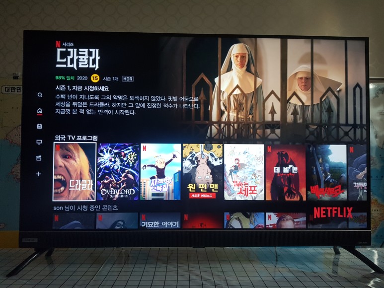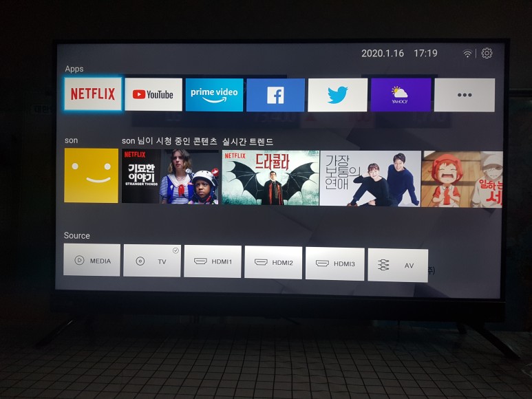 리모컨에 있는 홈 버튼을 누르니 쿠카TV에서 보던 홈화면과 유사하게 꾸며서 나오네요. 깜놀. 첫줄은 앱들을 나열해놨고, 두번째 줄은 넷플릭스 컨탠츠 목록, 세번째는 외부입력으로 구성되어 있습니다. 첫줄에 호기심이 갑니다. 19년 버전엔 이런 홈 화면이 없었고, 넷플릭스와 유튜브만 이용할 수 있었는데 확장이 되어 있습니다.