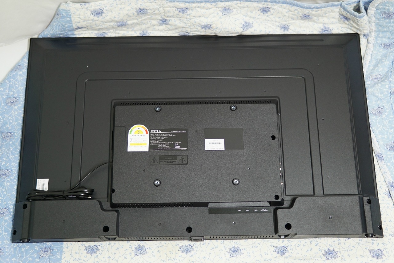 설치 설명서대로 쿠션역할을 해 줄 이불을 깔고, 그 위에서 조립을 진행했습니다. TV 뒷면의 모습을 보면,
