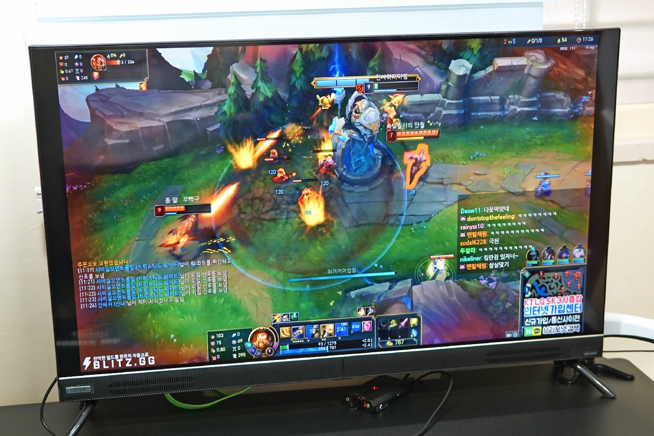 거리는 2m 이상이었지만, 게임 할 때는 50cm 거리에서 플레이 했습니다. 눈을 가득 채우는 압도적인 화면 크기와 해상도로 생생한 움직임을 볼 수 있습니다. 캐릭터 무기의 반사되는 빛과 표면의 재질까지 FHD 해상도에서 플레이 할 때 보다 훨씬 더 리얼하게 화면이 와 닿습니다. TV 특성 상 모니터와 픽셀의 집적도 차이도 있고