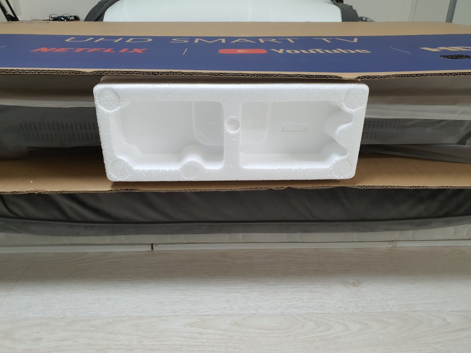 플라스틱을 다 제거하고 박스를 열면 티비 하단부가 나오는데