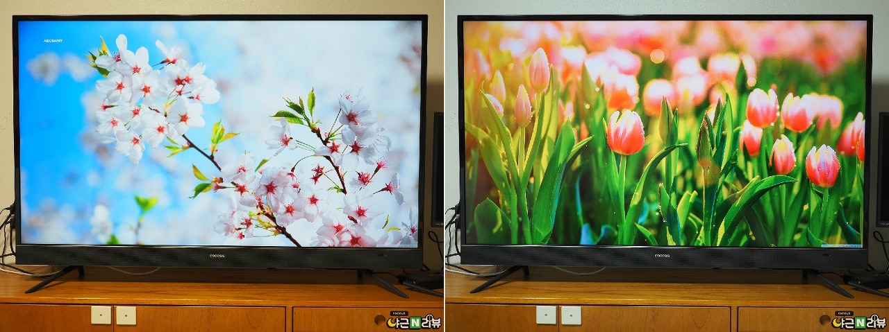 기본적으로 넓은 시야각을 제공하지만 모든 각도에서 완벽하게 동일한 색감을 보여주지는 않습니다. 하지만 그 차이가 크지 않아 예민하지 않다면 거실 어디에 앉아 있어도 시청에 무리가 없습니다. 조금 자세히 묘사하자면 정면에서는 다소 쨍하고 짙은 컬러를 좌우로 각이 벌어질수록 살짝 옅어지며, 위아래로 벌어질수록 색이 가벼워집니다. 특히 녹색 계열 색상에서는 각도에 따른 차이가 다소 도드라지기 때문에 알고 구매하시는 것이 좋겠습니다.