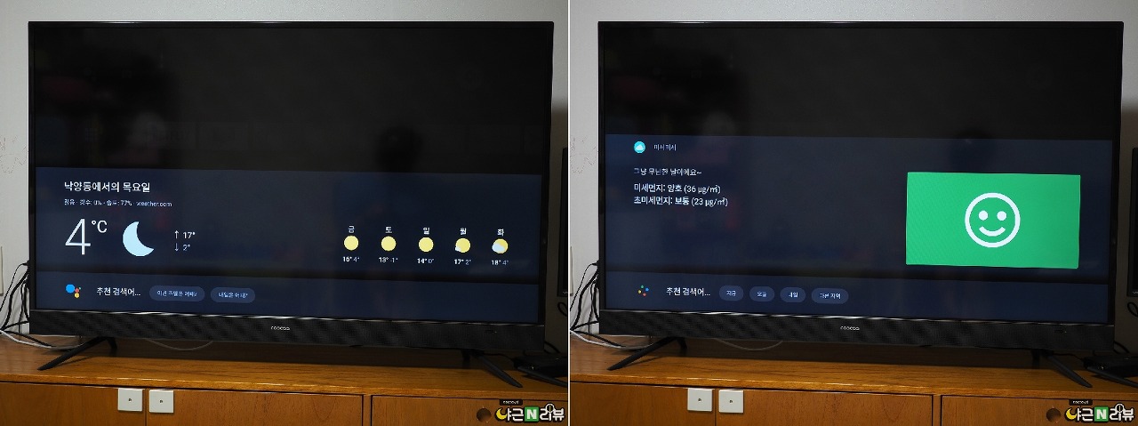 "오늘 날씨 어때?" 같은 기본적인 명령어뿐만 아니라 앱 실행이나 원하는 영상을 찾는 것도 어시스턴트를 이용해 수행할 수 있습니다. 꼭 어시스턴트가 아니어도 리모컨을 통한 음성 인식도 지원하기 때문에 다른 앱을 이용하면서 해당 앱의 음성인식 기능도 사용할 수 있습니다. "스마트폰에서도 잘 안 쓰는 구글 어시스턴트나 음성인식을 TV라고 쓸까?"하고 생각하시겠지만 스마트폰이나 PC와는 사용 환경이 다르다 보니 익숙해지면 음성인식을 정말 자주 사용하게 되더라구요. 음성 인식률도 좋아서 그냥 버튼 누르고 "유튜브 ~영상 찾아줘", "마인크래프트 영상 찾아줘~", "오늘 미세먼지 어떤가?"하는 식으로 적당히 이야기해도 잘 찾아주고 아이들이 들고 떠들어도 잘 찾아주니 어른들뿐만 아니라 아이들도 매우 좋아하는 기능 중 하나입니다.