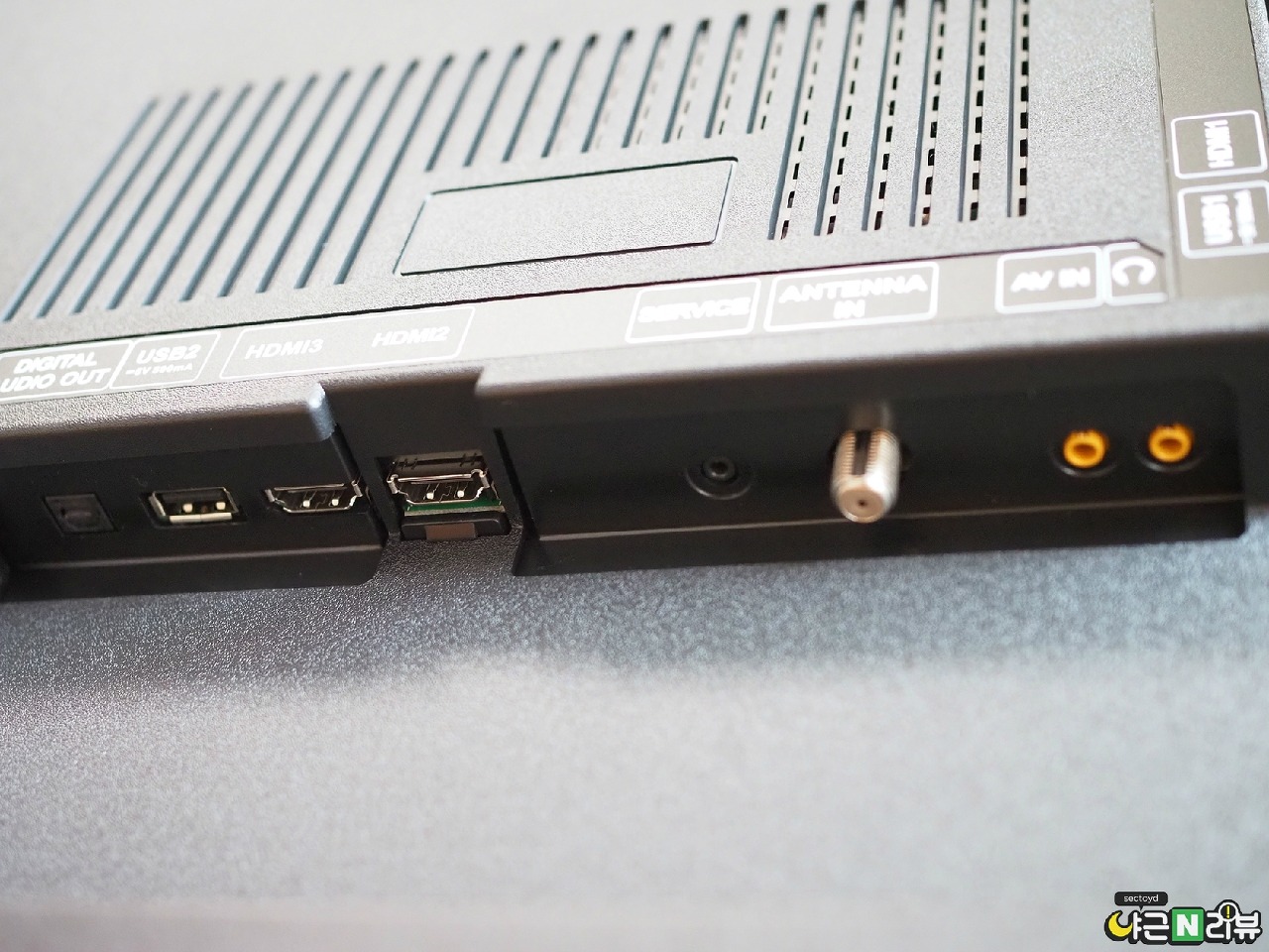 일반 모델과 비교했을 때 영상보다는 스마트가전에 가깝기 때문인지 상대적으로 지원하는 포트의 종류는 적지만 일반적으로 자주 사용하는 포트들은 제법 넉넉하게 제공합니다. 스탠드형임에도 포트 배열은 벽걸이 사용을 우선한 하단 배치로 되어 있습니다.