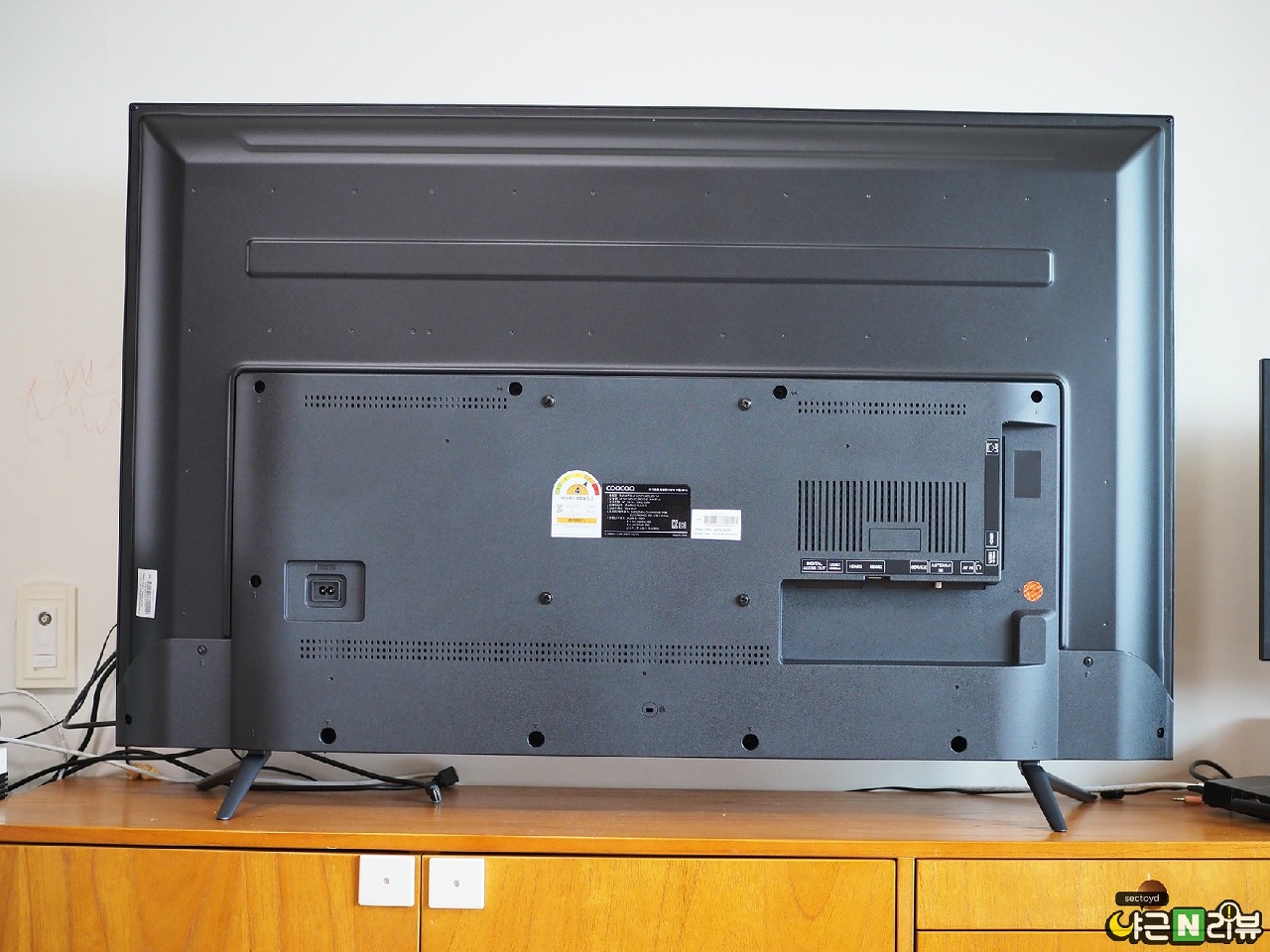 어댑터 내장형에 ㄱ자형 전원 플러그 제공으로 벽에 바싹 붙여 사용해도 전원 케이블에 부담이 가지 않도록 되어있습니다. 자잘한 부분이지만 이런 디테일은 쌓일수록 브랜드에 대한 이미지가 좋아지는 법이죠. 에너지소비효율 등급은 4등급으로 대기업 제품보다는 한두 단계 낮은데 큰 차이는 아닙니다.