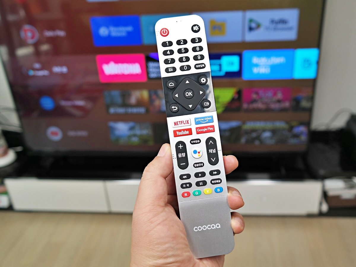 그리고 구글 어시스턴트의 음성 명령을 사용할 수 있어서 리모컨에는 전원 버튼과 외부 입력 버튼 사이에 마이크가 내장되어 있습니다. 그래서 구글 어시스턴트 버튼을 누르고 난 후 음성으로 명령을 내리면 됩니다.
