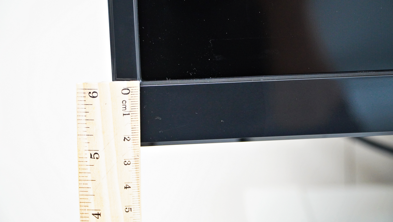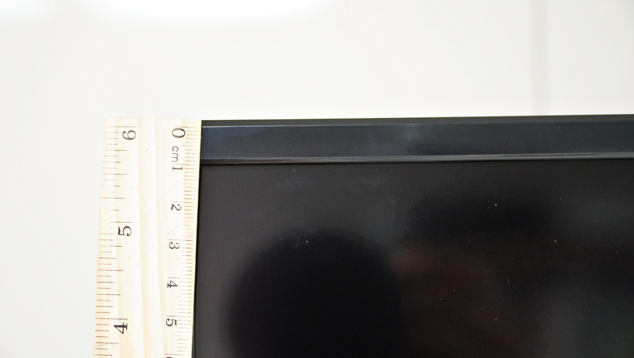 이렇게 2.3cm 정도 되는데요 아랫부분의 베젤은 크게 신경이 쓰이지 않습니다. 옆면과 윗면이 더 얇지만 체감이 되더군요. 물론 모두 검정 베젤이라 화면을 시청할 때 시각적으로 더 자연스러워 보입니다.