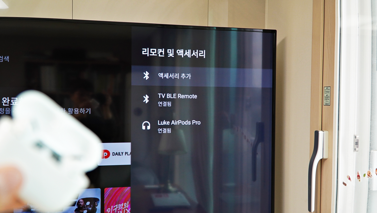 또한 요 녀석은 블루투스 5.0을 지원합니다. 따라서 밤에 혼자 영화를 볼 때 이어폰을 연결해서 시청을 할 수 있다는거죠. 처음에 이 블루투스 설정창에 가면 리모콘만 연결이 되어있는데요 여기에 제가 에어팟 프로를 연결해 보겠습니다.