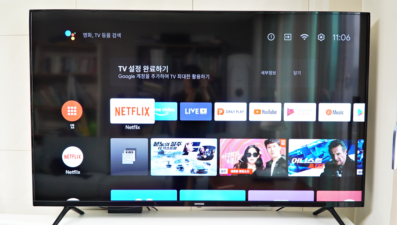 홈 화면입니다. 기본적으로 TV를 사용하여 소비하는 콘텐츠는 앱을 이용한 영상 콘텐츠들이 많죠. 물론 정규 편성도 보지만 요즘은 실시간이 아닌 저장된 VOD를 시청하는 시간이 더 많아진 것 같습니다. 따라서 이렇게 메인 화면에 넷플릭스 혹은 유튜브가 보이는건 개인적으로 좋더군요.