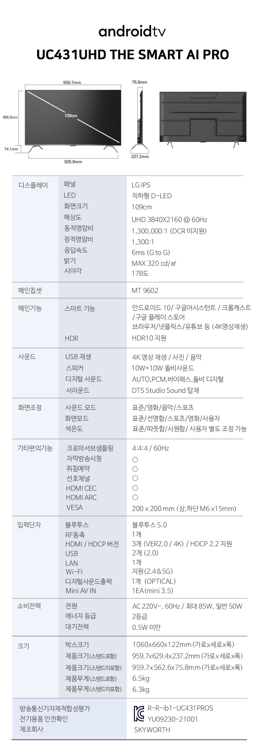 갈수록 얇아지는 TV 속에서 중소기업 TV이지만 이스트라 쿠카는 정말 놀라울 정도로 얇죠. 75.8*237.2mm이지만 실제로 화면 뒤쪽만 사이즈를 재면 1cm 정도라서 이거 이렇게 얇아도 화질 괜찮아? 이런 걱정까지 들기도 하고요. 스탠드 포함해서 6.5kg이지만 43인치라서 팔 길이가 된다면 누구든 가볍게 이동이 가능할듯싶어요. 아 이거 친구 집들이 선물로 사줘야겠어요.
