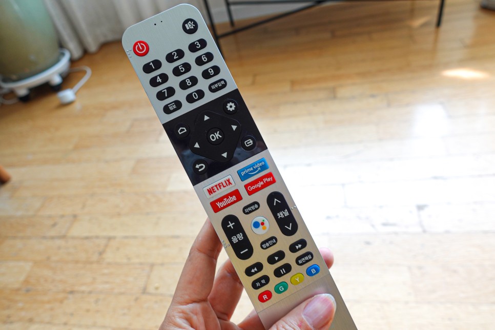 안드로이드 TV라서 기본 안드로이드에서 사용할 수 있는 앱들을 사용할 수 있고요. 리모컨에서 넷플릭스, 구글 플레이, 유튜브는 물론이고 구글 어시스턴트까지 지원이 됩니다. 리모컨이 너무 쉽게 나와서 미취학인 아이도 작동할 수 있을 정도였어요