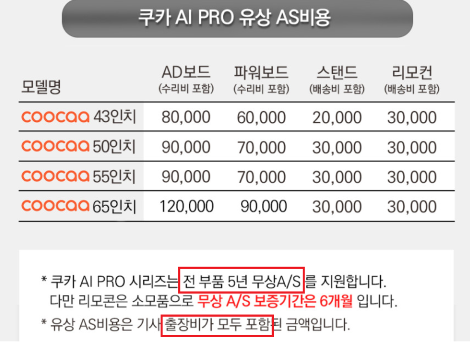 coocaa 라인업은 무상 AS기간이 무려 5년입니다. 일반적으로 티비를 구매하면 AS는 1년에서 2년 정도입니다.