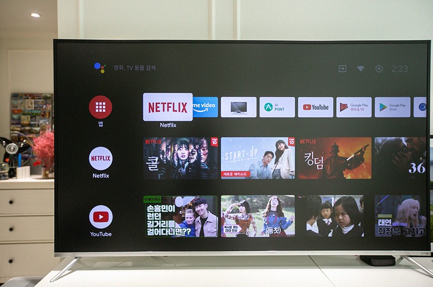 안드로이드 OS가 탑재되어 있어 스마트폰과 유사한 방식이라 접근 자체가 편하고 넷플릭스,,유튜브,웨이브, 왓챠 등 OTT 서비스로의 접근이 상당히 쉬웠는데요. 일단 기본 홈 런처 화면부터 상당히 쾌적하고 직관적으로 사용할 수 있습니다.
