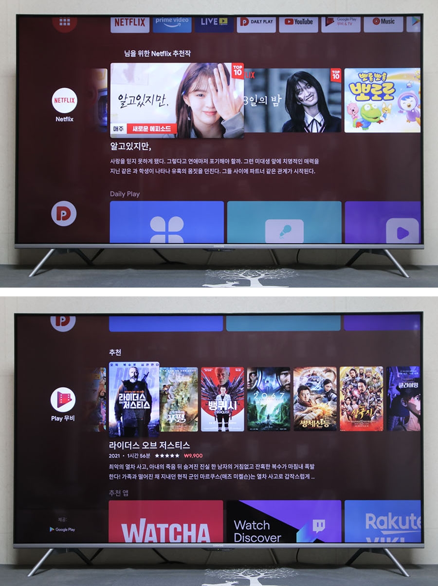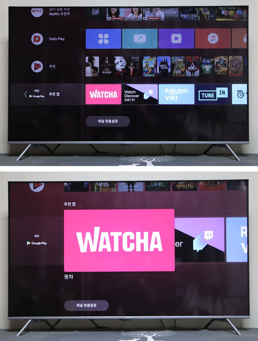 추천 앱은 그 수도 많지만 특히 우리가 이용하고 있는 왓챠, 티빙과 같이 서비스를 기본으로 등록하여 로그인만 하면 55인치 대화면에서 선명한 화질로 즐길 수 있습니다.