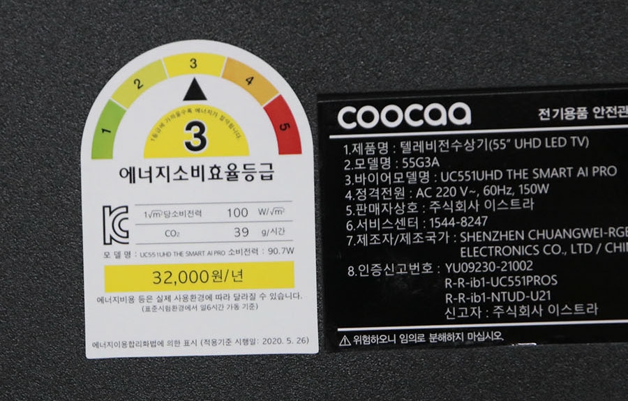 50인치 이상의 중형 TV의 경우, 작은 크기의 TV보다 소비전력이 많아 전기요금이 부담이 될 수 있습니다. 이스트라 쿠카 UC551UHD TV는 에너지소비 효율등급이 3등급으로 100W의 전력을 소비합니다. 연간 사용 기준으로 계산해 보면 약 32,000원 정도이며, 사용 시간에 따라서 조금씩 달라질 수는 있습니다.