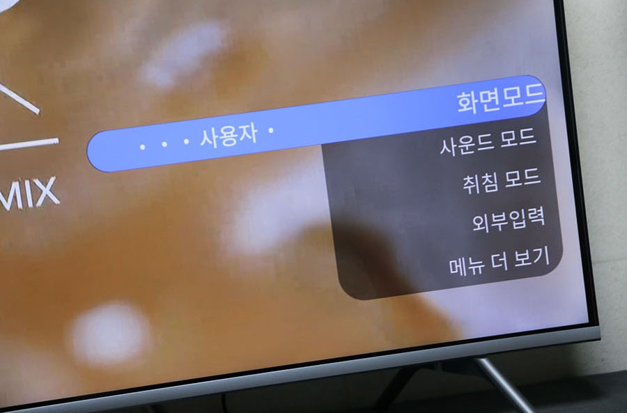 리모컨을 이용하여 간단하게 화면을 설정하는 메뉴입니다. 소리와 마찬가지로 각 콘텐츠에 맞는 화면을 바로 적용할 수 있는 화면모드를 지원하며 여기에는 선명한, 표준, 스포츠, 영화, 사용자 모드가 있습니다.