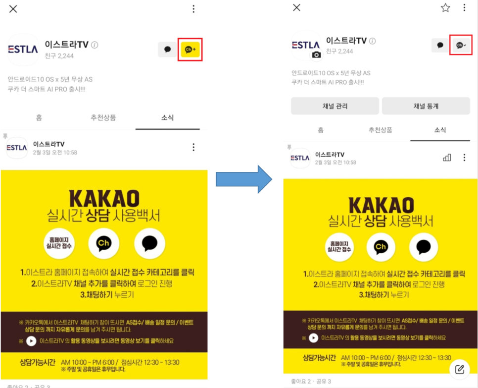 카카오채널 '이스트라TV'를 통해서 배송 / 문의 / 이벤트등 다양한 문의는 물론