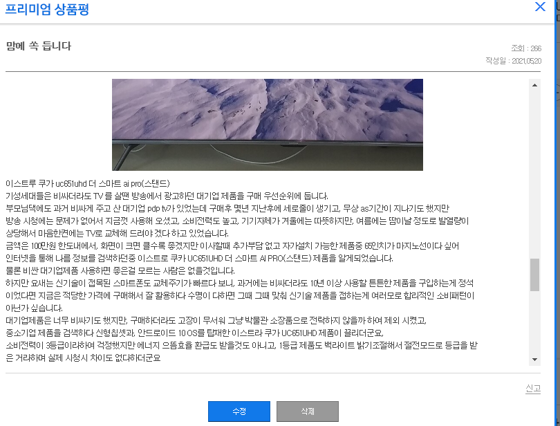 이번에 보여드릴 리뷰는 65인치 쿠카모델을 구매해주신 분입니다.