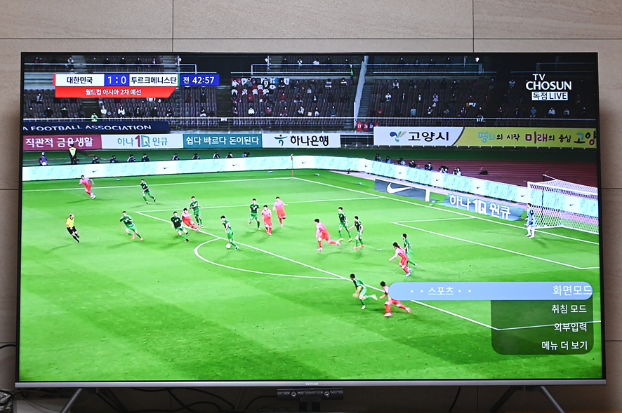 이스트라 쿠카 65인치 TV(COOCAA UC651UHD)구매 기념으로 바로 월드컵 아시아 2차 예선을 관람했습니다. 화면이 크니 집에서 보는데도 현장감이 아주 좋습니다. 기본적인 세팅은 많은 후기들에 나온 대로 화면 모드는 선명함(표준, 영화, 스포츠 등도 가능)이 좋았고 사운드는 DTS 스튜디오 사운드 활성화를 했습니다. 그 외 세부적으로 밝기, 색상, 채도 등도 있지만 예민한 편은 아니어서 이 정도로 TV 세팅은 끝!