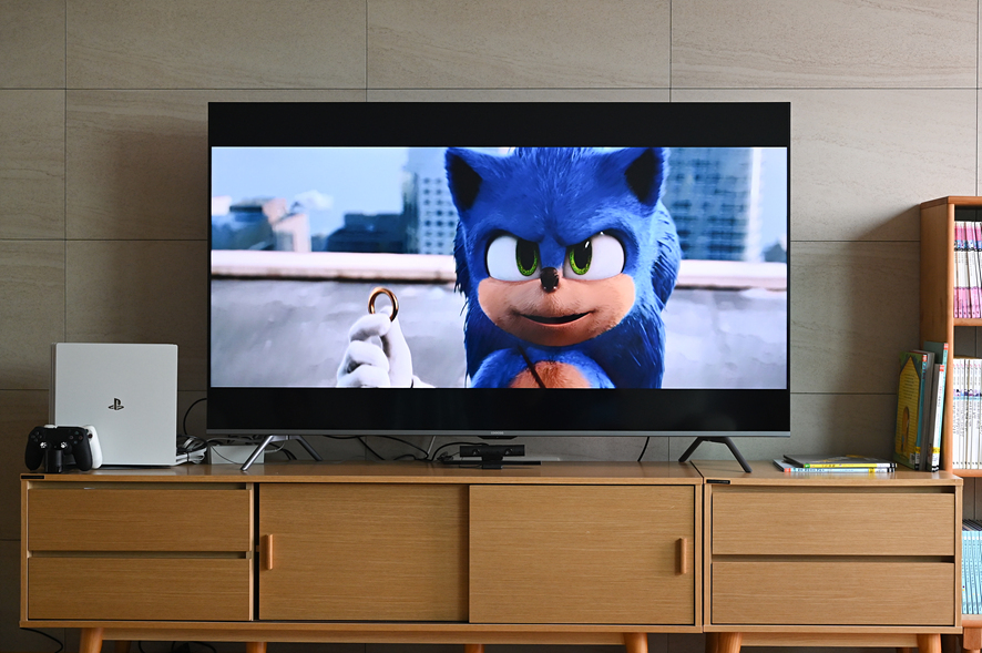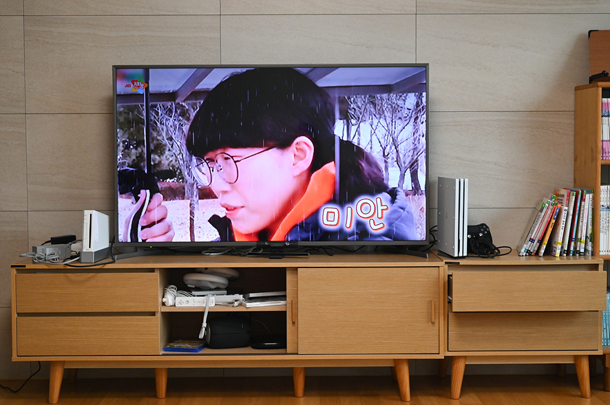 모든 설치와 TV 세팅이 끝나고 아이들과 주말을 이용해 영화 한 편을 관람했습니다. 대낮 해가 쨍하게 들어오는 환경이었는데요. 높은 명암비, IPS RGB Panel 적용, 178도 시야각 지원으로 3년 전 구매한 JVC 55인치 4K TV와 비교가 안될 정도였습니다. 특히 대 낮임에도 불구하고 쨍한 화면과 옆에서 보는 화질 저하는 거의 없었습니다.(동영상 참조) 정말 가성비 갑 오브 갑이네요!