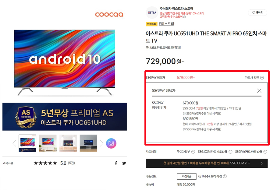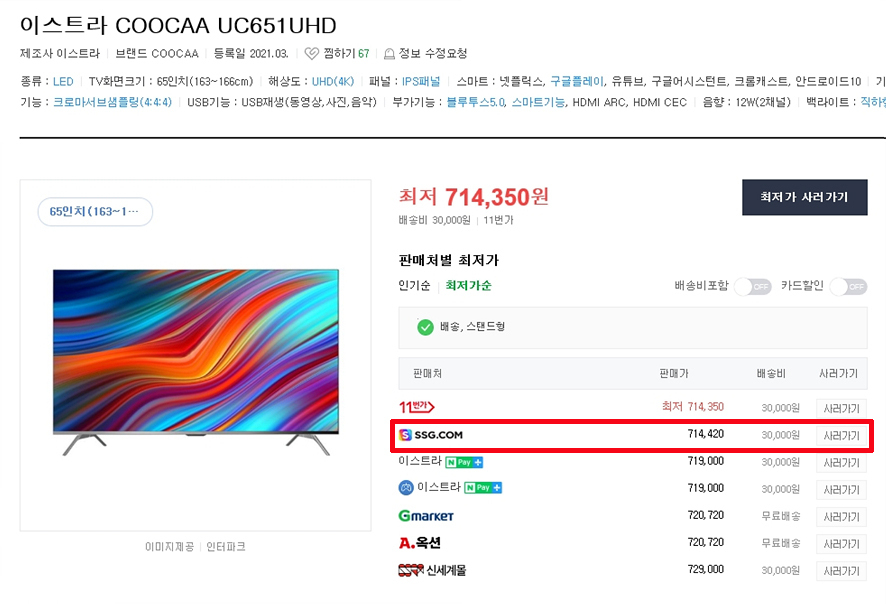 이번에도 삼성, LG 제품이 아닌 가성비 좋은 중소기업 제품으로 TV를 구매하기로 결심했습니다. 유튜브, 블로그 후기들 그리고 무엇보다 실제 구매한 후기들을 천천히 찾아봤는데요. 압도적으로 이스트라 쿠카65인치 TV(COOCAA UC651UHD)가 리뷰가 많았고 리뷰 평도 대부분 좋았습니다. 전자 제품을 구매할 때 생각보다 고민을 많이 안 하고 구매하는 스타일이라 바로 구매 결정을 했습니다.