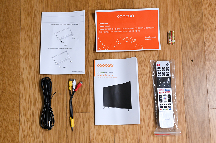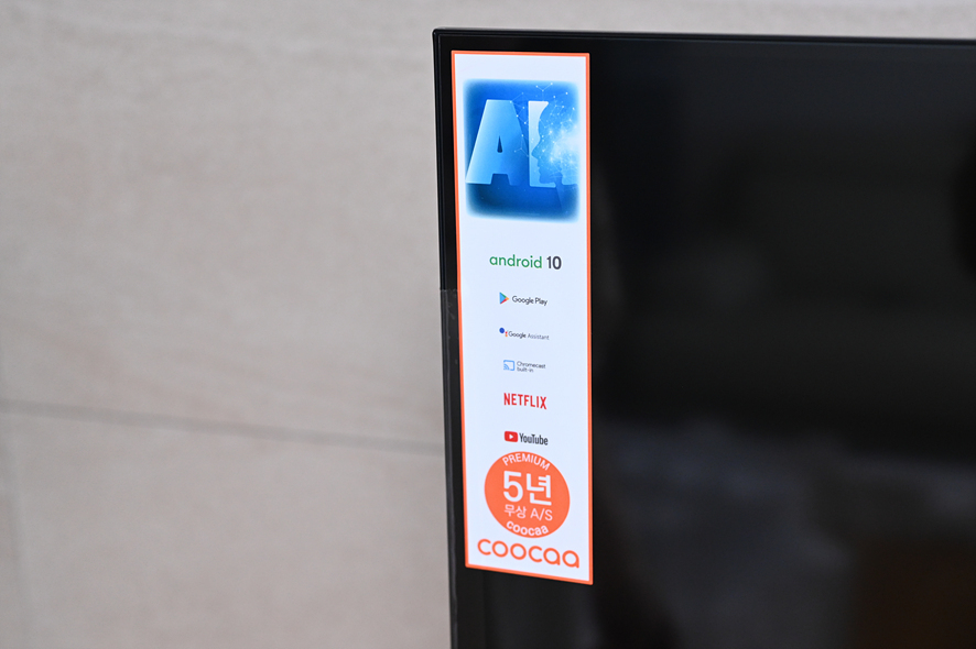 구성품은 심플합니다. 매뉴얼, 전원 케이블, 비디오 케이블(참고로 닌텐도 위에 활용), 전용 리모컨(배터리 포함)입니다. 외관 뒷면은 간단하게 에너지 효율등급(3등급)과 모델명 등이 나와있습니다. 옆면은 비교적 얇은 편이며 오른쪽 옆으로 주요 확장 포트들이 있습니다. LAN, Digital Audio out, HDMI 3개, USB 2개, 안테나 1개, AV IN 구성으로 부족함이 없습니다. 정면은 이스트라 쿠카 65인치 TV(COOCAA UC651UHD) 주요 스펙과 5년 무상 A/S 스티커가 부착되어 있습니다. 배젤은 정말 티가 안 날 정도로 얇습니다.