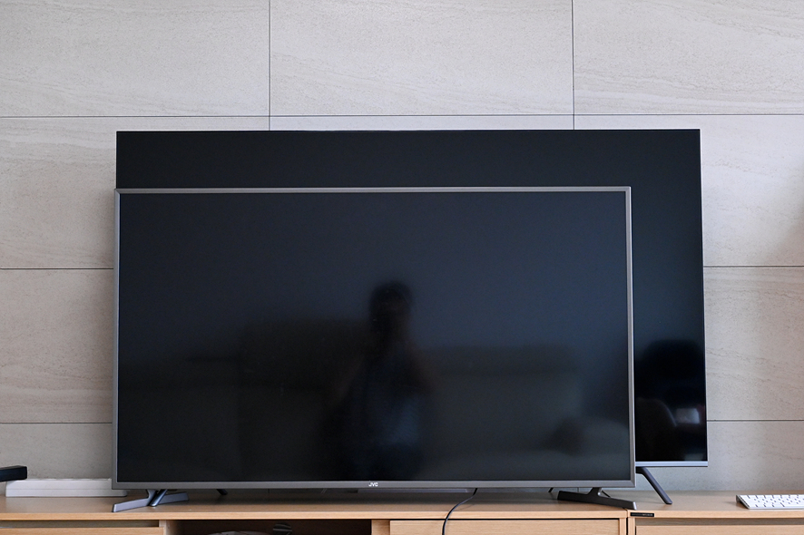 우선 기존에 사용하던 JVC 55인치 모델과 비교를 해봤습니다. 10인치 차이가 얼마나 되겠어? 싶었지만 정말 차이가 많이 납니다. 베젤과 높이를 감안하더라도 65인치 크기는 확실히 큽니다. 과연 3년 뒤 맞이하게 될 75인치 TV는 어느 정도 될는지 벌써부터 기대가 되네요. 역시 TV는 거거익선!