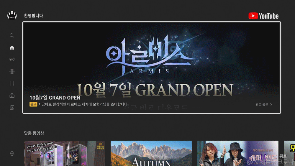 제품을 통해, 유튜브를 실행해 봤습니다. 기본적으로, 홈 화면에서 다양한 맞춤 동영상과 추천 영상을 제공해, 알 수 없는 알고리즘으로 추천된 영상들로 시간을 보낼 수 있고, 게임과 음악, 영화 탭은 별도로 제공하고 있으며, 구독 탭을 활용해, 구독 중인 크리에이터의 영상을 모아서 확인할 수 있습니다. 다만, 리모컨으로 제어하는 특성상, 검색이 조금 어려운 편인데요. 키보드 자판 하나하나 이동해, 확인 버튼을 눌러 검색을 해야 하기 때문에, 타이핑보다는 음성 명령을 권장합니다.