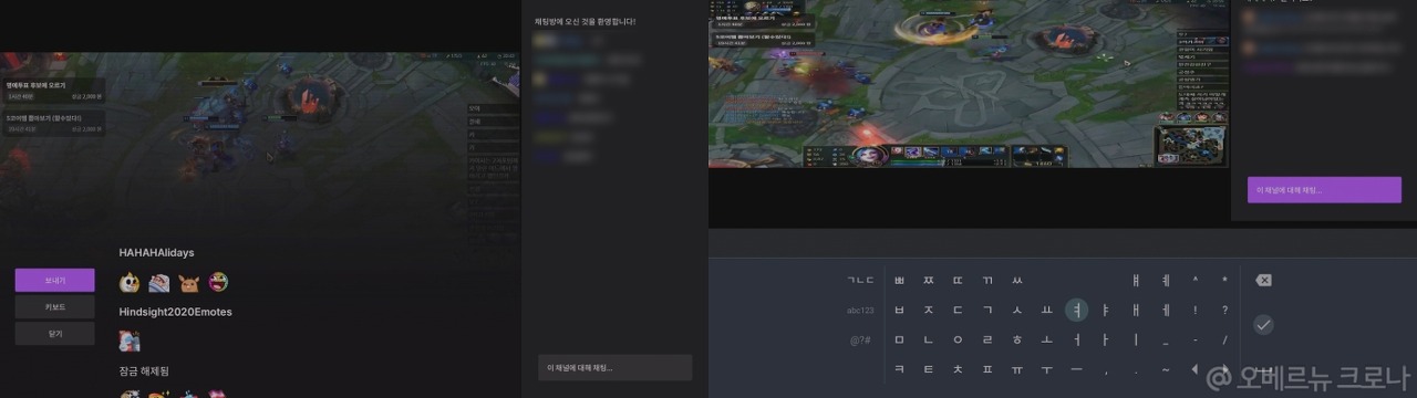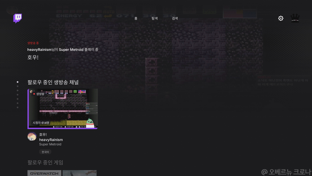 저는 주로, 퇴근 후에 실시간 스트리밍 채널인 트위치TV를 이용하는데요. 제작된 영상 콘텐츠를 소비하는 유튜브나 넷플릭스와는 다르게, 실시간 방송이 위주인 플랫폼으로, 대부분 게임 실황을 다루고 있습니다. 때문에, 메인 화면 역시, 현재 방송 중인 스트리머 위주로 표시하고 있는데요. 실시간으로 이루어지는 방송인 만큼, 상호 소통 역시 크게 작용하는 플랫폼으로, 이모티콘과 채팅 기능을 TV에서도 사용할 수 있습니다. 다만, 글자를 일일이 리모컨으로 타이핑해야 하기 때문에, 채팅은 조금 어렵네요.