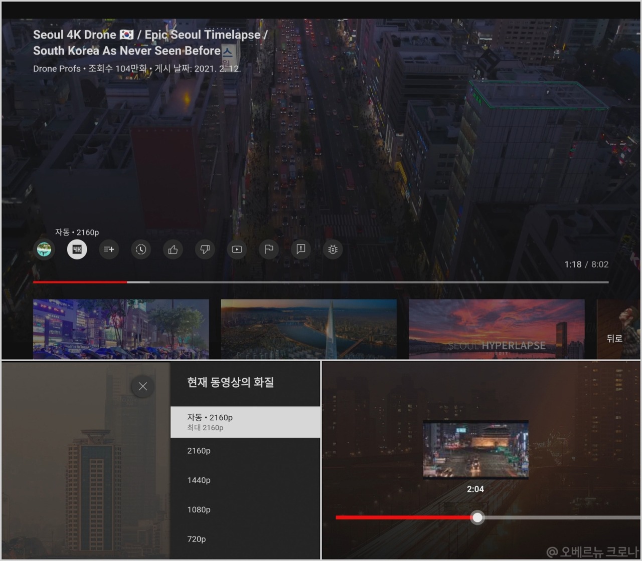 영상 재생 시에는, PC와 마찬가지로 화질 설정과 재생목록 추가, 좋아요 등의 피드백 기능을 이용할 수 있습니다. 타임라인을 통해, 재생 위치 건너뜀이 가능하며, 확인 버튼으로 광고 영상을 스킵 할 수 있네요.