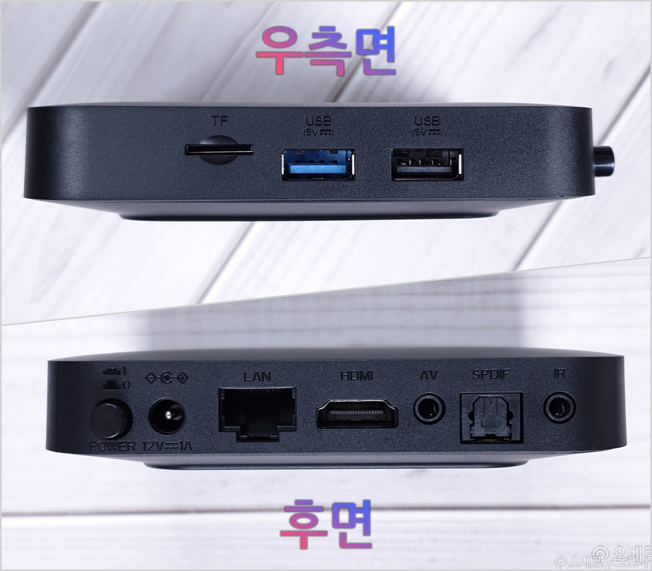 제품의 크기는 가로, 세로가 동일한 110mm의 정사각형 형태를 띠고 있습니다. 스틱형 제품보다는 크기가 큰 편이지만, 셋톱박스치고 상당히 콤팩트하게 제작된 것을 확인할 수 있는데요. 모서리 부분을 둥글게 하여, 부드러운 분위기를 연출하고 있으며, 깔끔한 블랙 컬러로 통일해, 어디에 두어도 잘 어울리는 모습입니다. 전면 쪽에는 LED 인디케이터를 구성해, 전원과 네트워크 연결 상태를 직관적으로 확인할 수 있도록 했네요.