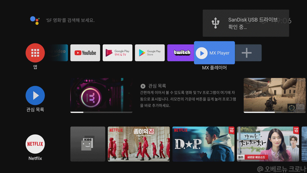 이스트라 쿠카 ATBOX001 AI PRO의 메인 화면입니다. 안드로이드10 OS와 글 크롬캐스트 기능 지원 여부를 확인할 수 있는데요. 맞춤 화면의 경우, 대부분 OTT 플랫폼 위주로 구비되어 있으며, 추천 채널 탐색 위주로 구성되었습니다.