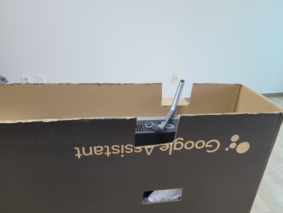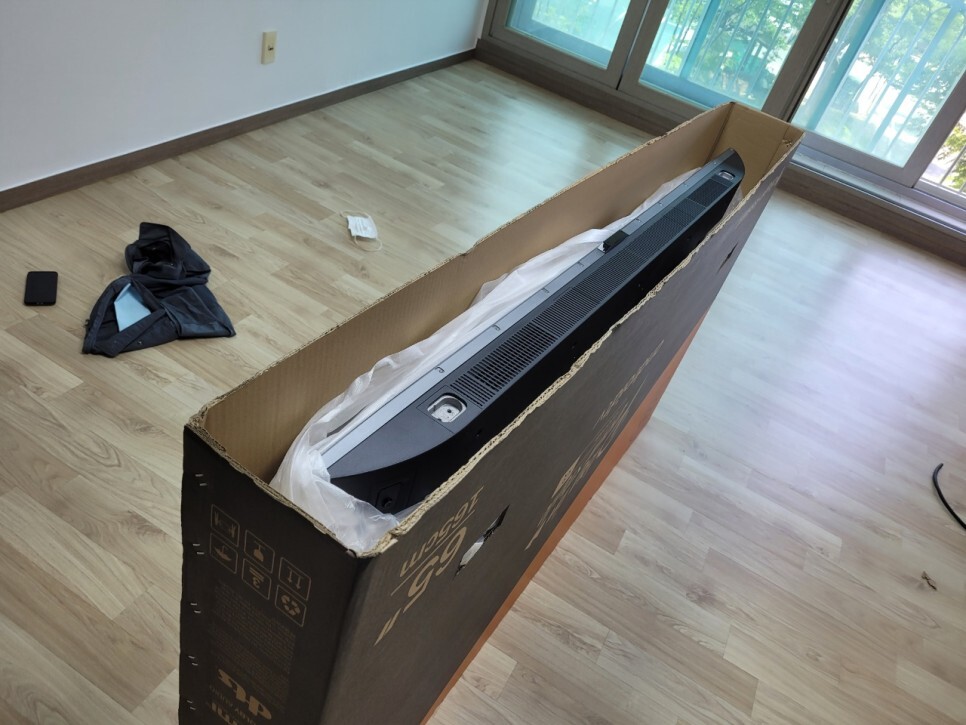 7. 티비를 다시 조심히 뒤집어서 박스 위로 빼내고 인증사진 찍기.