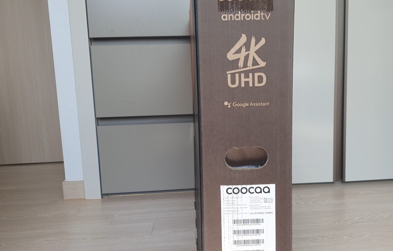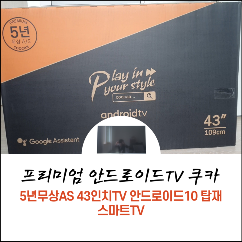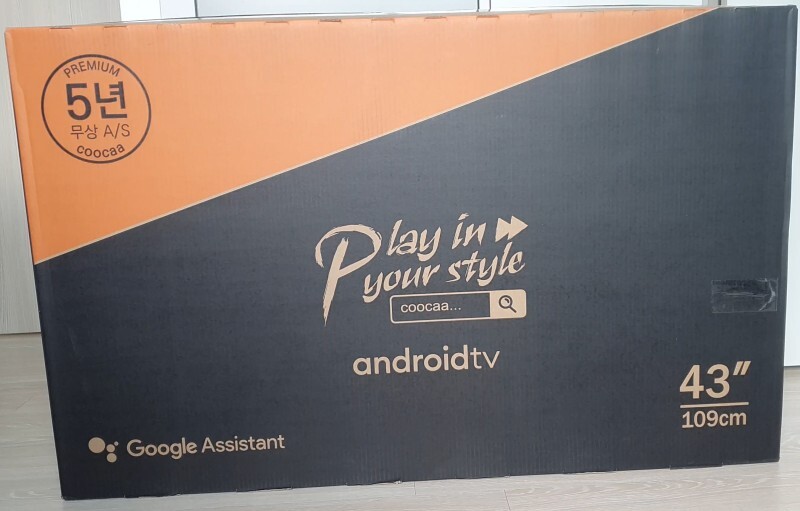 제품 박스입니다. 위에서도 말씀해드렸듯이 무상보증이 5년이라고 크게 표시가 되어 있습니다. 그리고 아래쪽에는 구글 어시턴트 가 된다고 나와 있고 그리고 TV가 43인치라고 나와 있습니다. 옆쪽도 살펴보도록 하 갰습니다 4K[UHD]라고 나와 있습니다.
