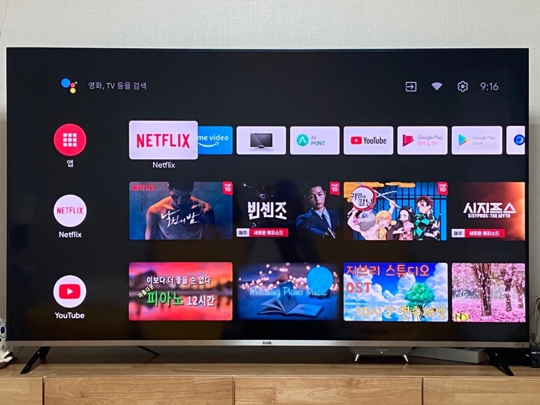 안드로이드 홈화면에서 넷플릭스나 유튜브 또는 설정 등을 맞출 수 있다.