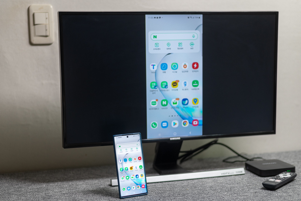 Chromecast 내장으로 무선 미러링도 쉽게 할 수 있습니다. 다음 화면과 같이 스마트폰 미러링을 통해 큰 화면 이용이 가능합니다. 만일 소그룹으로 회의, 교육 등을 자주 한다면 이런 미러링 활용도 안드로이드TV 박스를 십분 활용하는 방법이 아닐까 싶습니다.