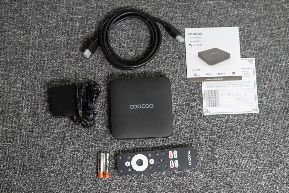 구성품에는 본체, HDMI 케이블, 전원 어댑터, 설명서 및 리모컨인데, 배터리까지 포함되어 있어 별도로 준비할 필요가 없다는 점도 소소하지만 마음에 들더군요.