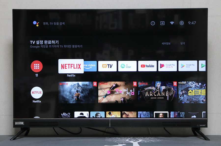 안드로이드 스마트 TV의 장점은 TV 시청 외에 셋탑박스 기능을 추가하여 넷플릭스, 유튜브, 프라임 비디오 같은 OTT 서비스를 직접 이용할 수 있다는 것입니다. 앱, 넷플릭스, 유튜브 등 많이 시청한 영화 등의 리스트를 좌측에 그 세부 내용을 우측에 표시하여 쉽게 사용할 수 있는 심플한 구조입니다.