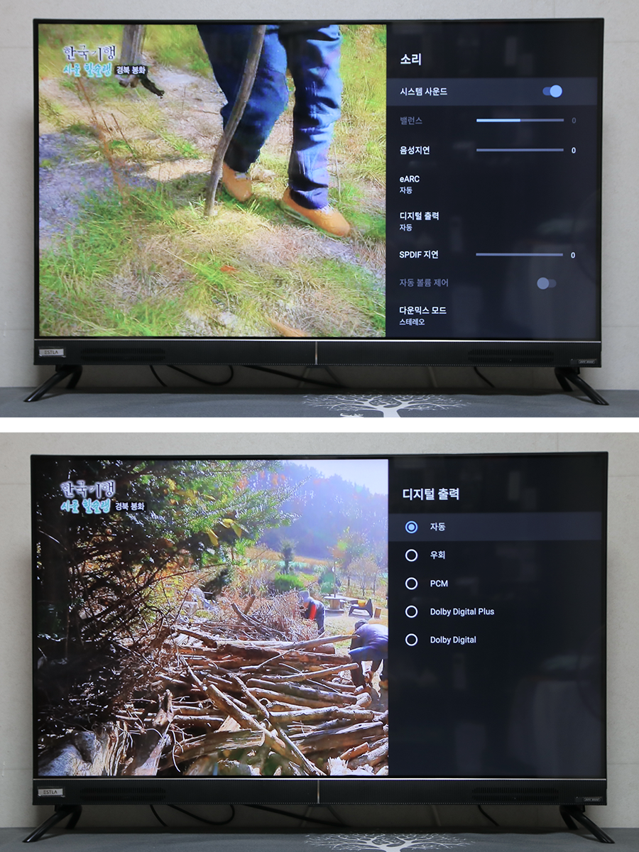 소리에는 시스템 사운드, 밸런스, 음성지연, eARC, 디지털 출력, SPDIF, 자동 볼륨 제어, 다운믹스 모드 등 사운드와 관련된 모든 기능을 제어할 수 있는 메뉴들로 구성되어 있습니다.