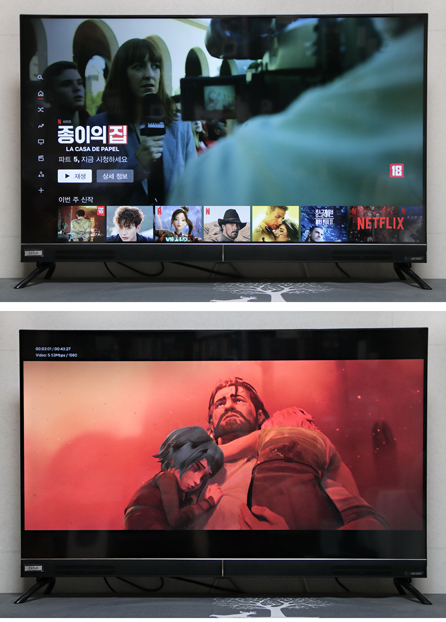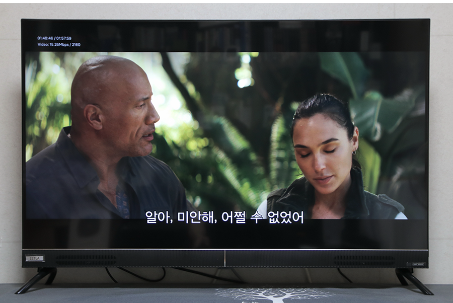 VA RGB 패널을 사용하여 밝기, 색감, 화질 모두 만족스러우며 5GHz 와이파이로 연결되어 4K 영상을 재생해도 중간에 멈추지 않고 처음부터 끝까지 안정적입니다.