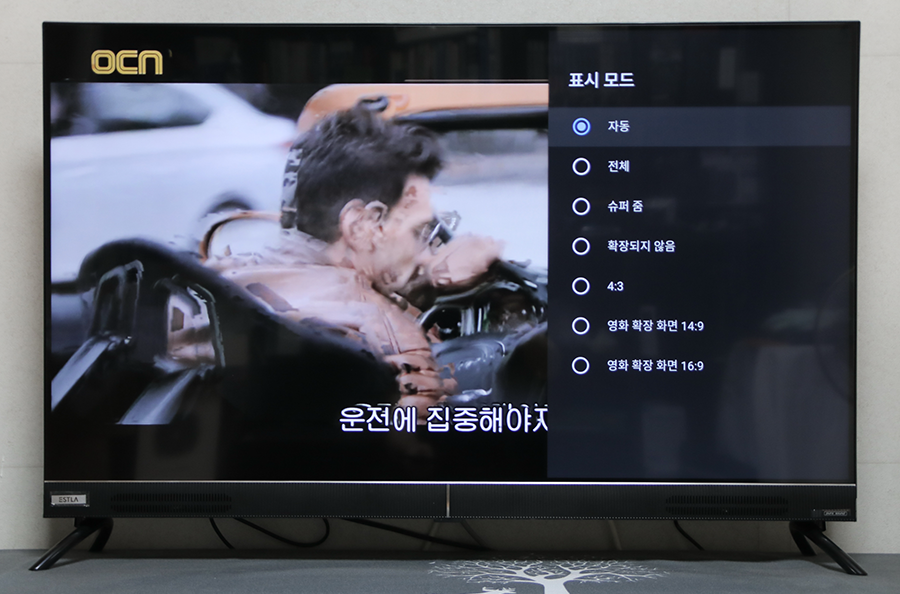 리모컨 하단에 있는 격자 무늬의 버튼을 누르면 표시 모드, 즉 화면 비율을 선택할 수 있는 메뉴가 오른쪽에 팝업됩니다. 기본 설정은 자동이며, 그 외에도 컨텐츠 화면비에 맞게 전체, 슈퍼 줌, 확장되지 않음, 4:3, 영화 확장 화면 14:9 / 16:9로 선택하여 최적의 화면비로 시청할 수 있습니다.