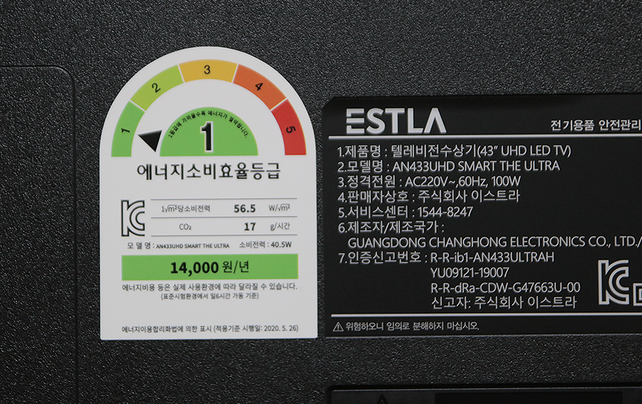 이스트라 AN433UHD 4K TV는 50인치가 넘지 않는 소형이라서 소비전력이 낮아 전기 요금 또한 부담이 없습니다. 에너지 소비 효율등급 1등급으로 40.5W의 소비전력을 가지고 있습니다.