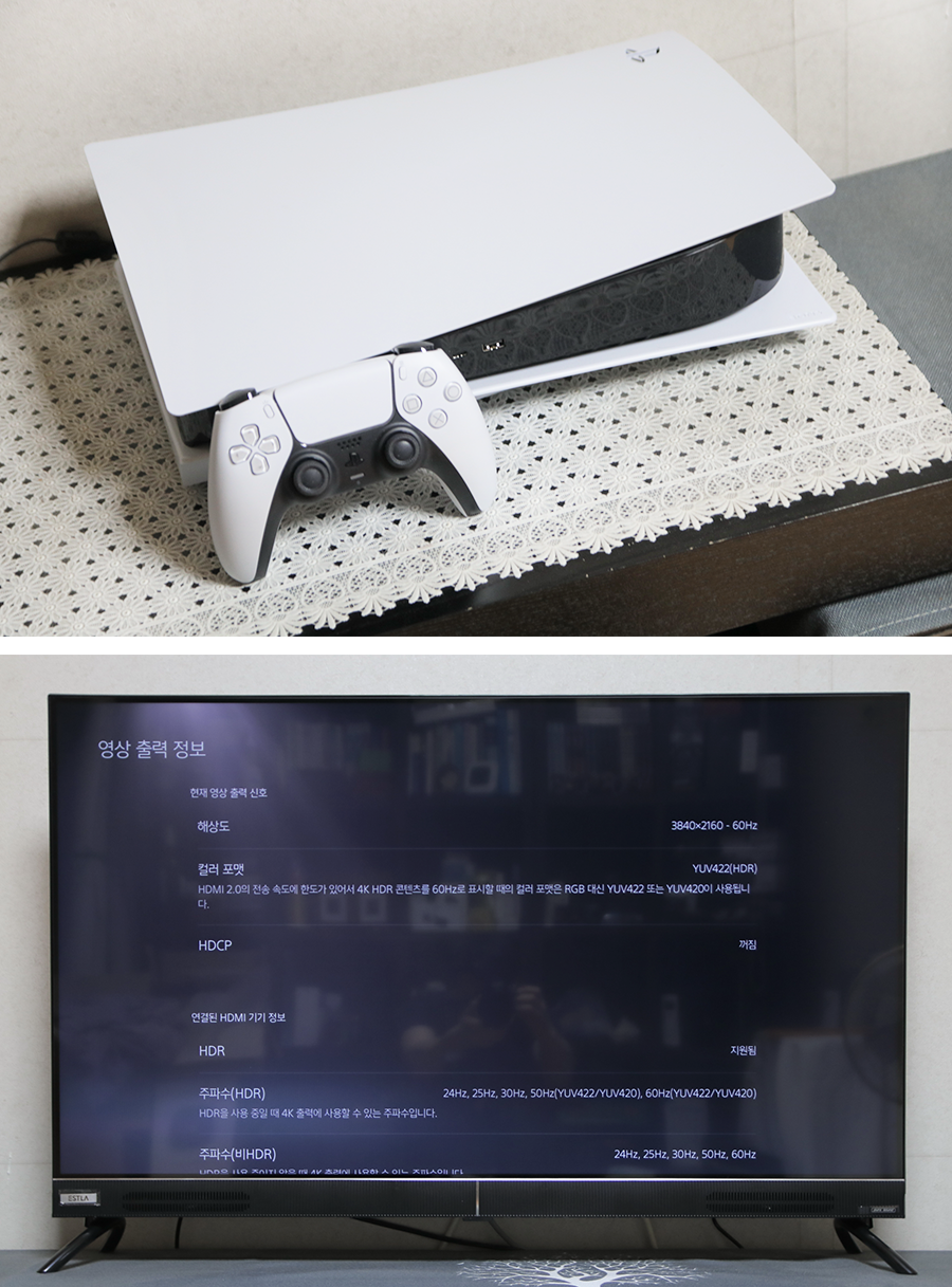 무선 리모컨의 입력 버튼을 누르면 TV, AV, HDMI1, HDMI2, HDMI3, Android TV 홈 순서로 선택할 수 있으며, 바로 진입할 수 있는 HDMI 단축키를 지원하지 않습니다. IPTV 셋탑박스, 4K 플레이어, PS5를 HDMI1 포트에 연결하면 3840x2160 UHD 해상도로 출력되는 것을 확인할 수 있답니다.