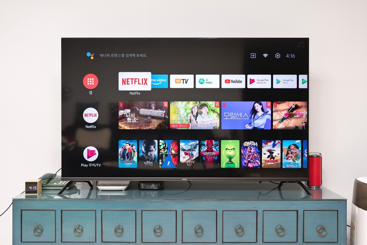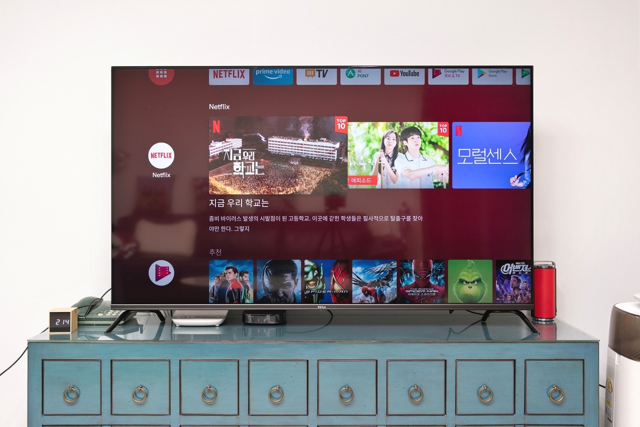이스트라 AU553QLED SMART THE ULTRA의 가장 큰 특징 중 하나는 역시 안드로이드 11이 적용된 스마트 TV라는 점입니다. 때문에 넷플릭스나 유튜브, 와차, 웨이브 등의 OTT 서비스를 별도의 셋톱박스 연결 없이 자유롭게 사용할 수 있습니다.