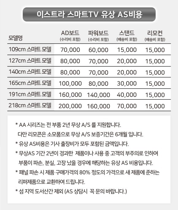 유상 AS비용도 명확하게 제시하고 있습니다. 이전에 사용하던 55인치 모니터 AD보드 가격이 30만원대여서 @@ 차라리 새걸 사지...하다가... 이왕이면 65인치지!! 그래서 고른 제품이 AA650UHD IPS THE SMART Pro!!!