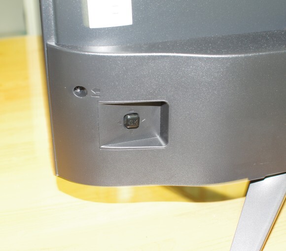 우측 하단 정면에 파란색의 램프가 보입니다. 파워오프시 파란색으로 점등되고 파워온에서 꺼집니다. 우측 하단 뒷면에 조그 형식의 스위치가 보입니다. 전원 온오프와 설정, 입력선택 등을 할 수 있습니다. 조그 스위치를 누르면 전원이 켜집니다. 켜진 상태에서 한번 더 누르면 아래와 같은 선택창이 나옵니다.