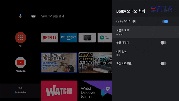 볼륨 레벨러, 대화 강화, 가상 서라운드를 조정할 수 있습니다.